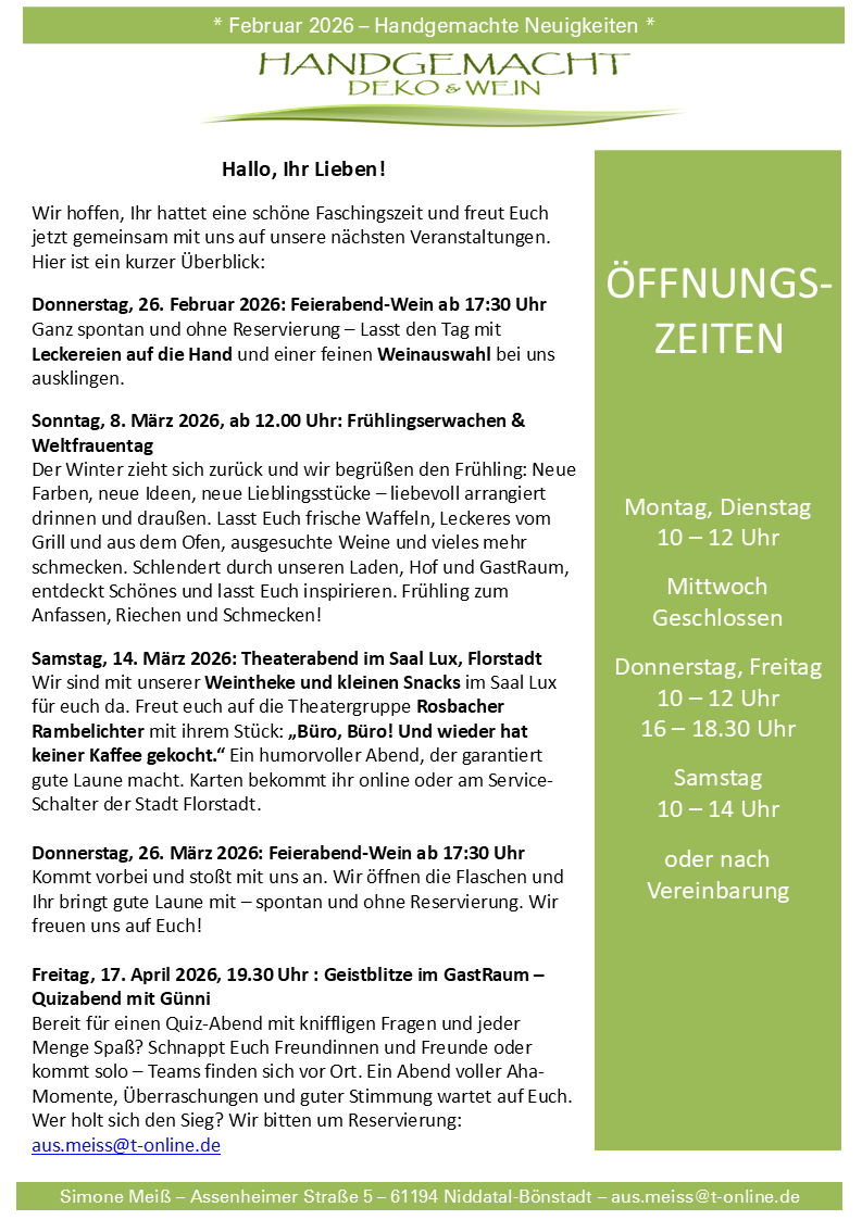 Ab Donnerstag, 09.04.2026 sind wir wieder zu den bekannten Öffnungszeiten für Euch da!
